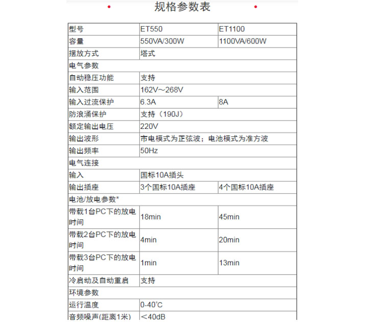 山特ET1100/550 UPS是針對中國電力環(huán)境設計的自動穩(wěn)壓型智能UPS,內置先進的MCU控制單元,有效的解決5 種電力問題:市電斷電、電壓下陷、浪涌、欠壓、過壓。功能強大,美觀時尚,是電腦、POS機、收銀臺、ATM、路由器、閘機等設備的有力保護。 注:ET 1100/550 UPS主要通過電商平臺銷售,購買請訪問天貓和京東的授權旗艦店、專賣店。