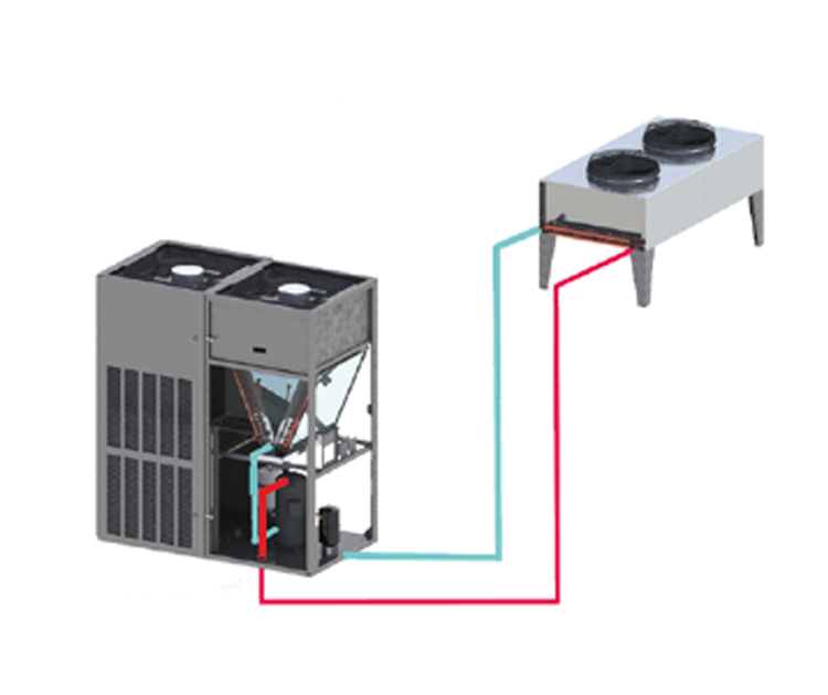 由機組室內(nèi)風機驅(qū)動機房內(nèi)空氣流動,在此過程中室內(nèi)空氣流經(jīng)空調(diào)蒸發(fā)器,將熱量傳遞給制冷劑,制冷劑經(jīng)由制冷系統(tǒng)管道輸送到室外,通過冷凝器將熱量散播到室外環(huán)境中??照{(diào)機組和室外冷凝器通過封閉的制冷管道相連。
