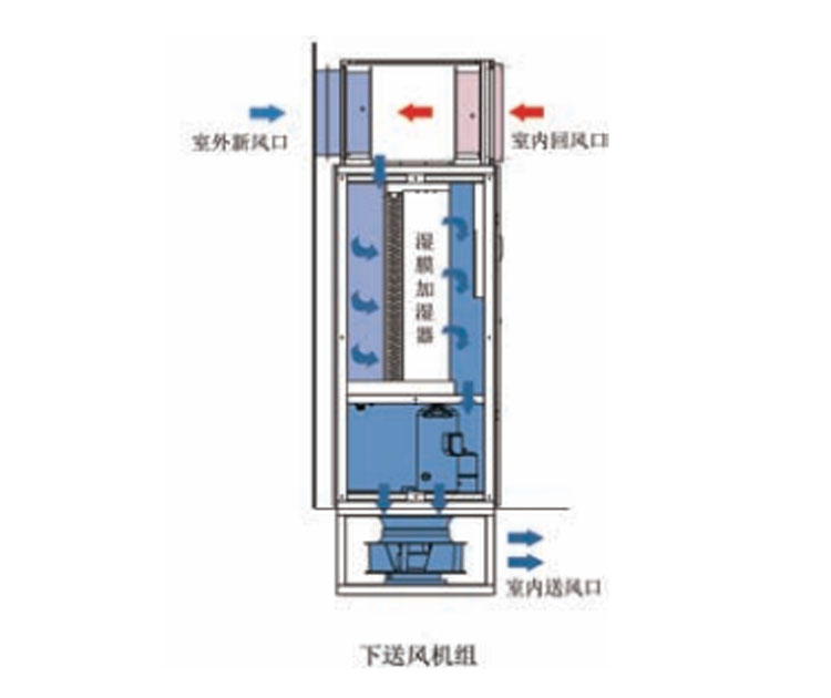 當(dāng)室內(nèi)外溫差達(dá)到節(jié)能控制溫度時,新風(fēng)功能啟用。室外新風(fēng)經(jīng)新風(fēng)過濾器處理后,與室內(nèi)回風(fēng)充分混合,經(jīng)濕膜加濕器等焓加濕,送入室內(nèi)。通過控制室內(nèi)回風(fēng)閥和室外新風(fēng)閥開度調(diào)節(jié)混風(fēng)比,來保證送風(fēng)溫濕度(送風(fēng)溫濕度用戶可根據(jù)實際需求進行設(shè)置)。室內(nèi)多余空氣通過房間壓差排風(fēng)閥或排風(fēng)風(fēng)機將其直接排往室外。當(dāng)室內(nèi)外溫度不滿足節(jié)能控制溫度時,新風(fēng)功能停止,機械制冷啟動,室外新風(fēng)閥完全關(guān)閉,機組全部采用回風(fēng)處理方式,調(diào)控室內(nèi)溫濕度滿足使用需求。